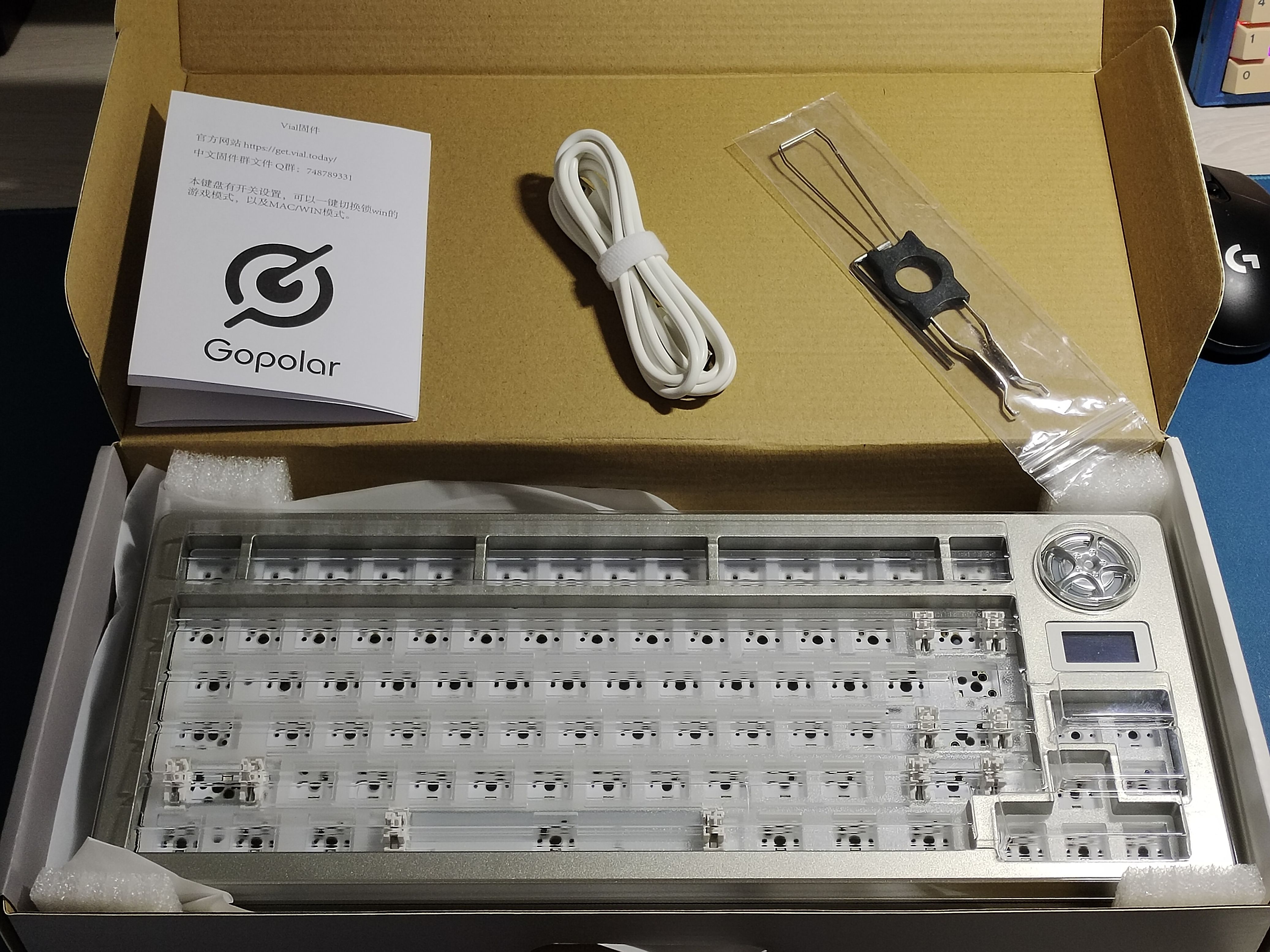 打開包裝,內部非常簡單。防塵罩內放着鍵盤鍵盤旁邊僅有一根數據線,一本說明書,一包拔軸拔鍵器和檸6腳螺絲的螺栓
