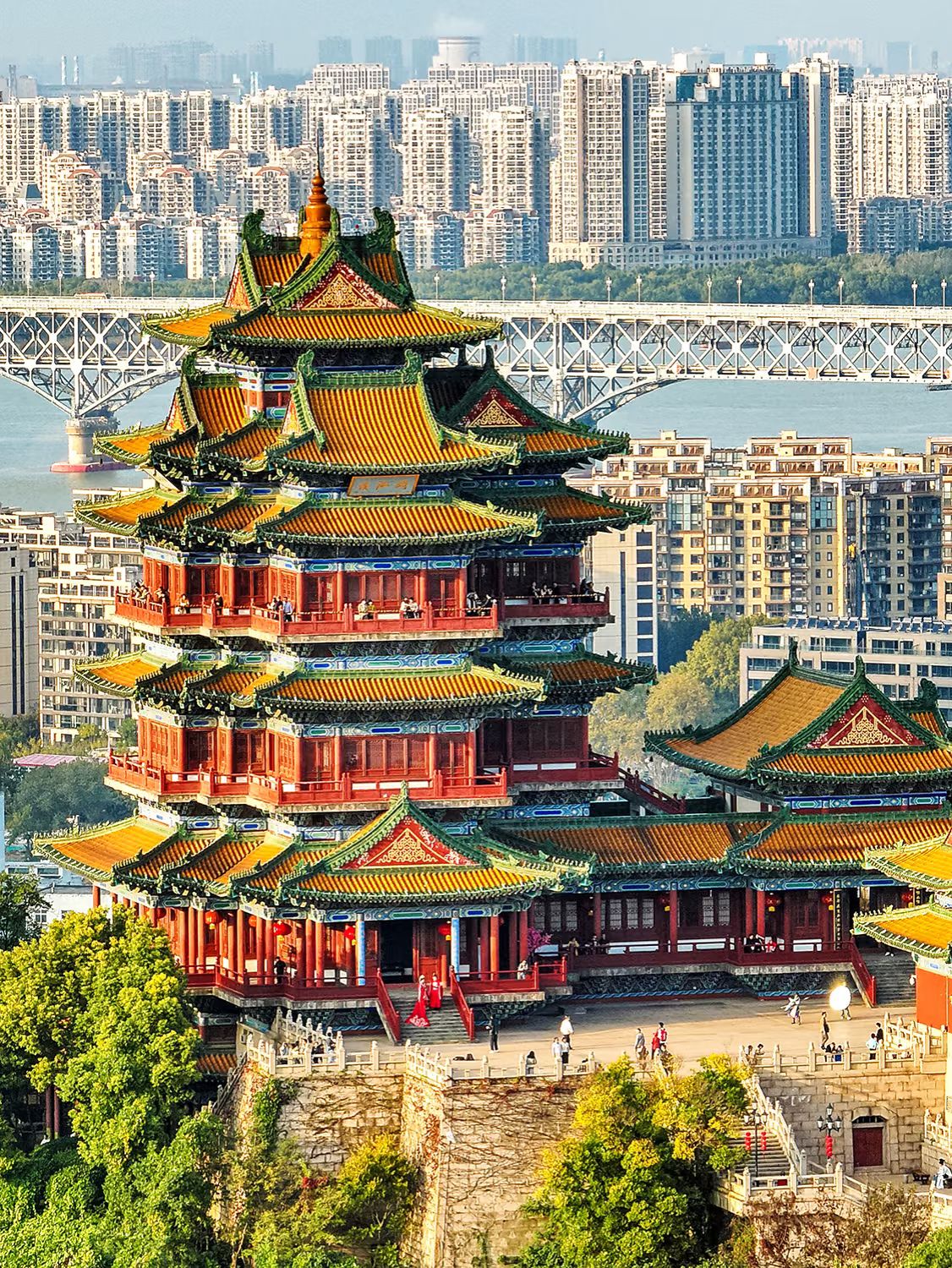 黃鶴樓位於湖北省武漢市海拔高度61.7米的蛇山頂,它以清代“同治樓”爲原型設計。樓高5層,總高度51.4米,建築面積3219平方米。72根圓柱拔地而起,雄渾穩健;60個翹角凌空舒展,似黃鶴騰飛。樓的屋面用10多萬塊黃色琉璃瓦覆蓋。在藍天白雲的映襯下,黃鶴樓色彩絢麗,雄偉壯觀。