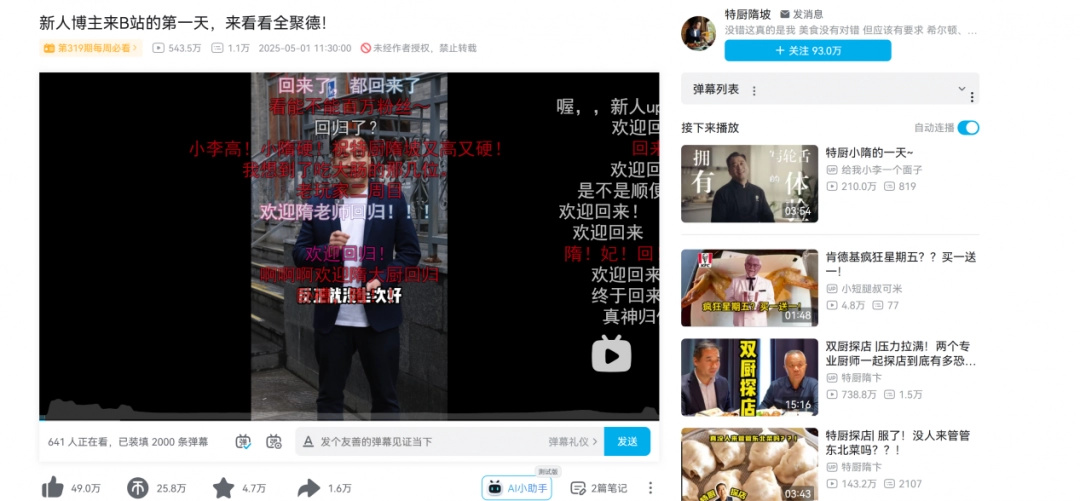 新账号的两个视频,不仅延续了原本的创作风格,还用新的“刷脸系列”首作《揭秘!吃一顿国宴是什么体验?》,进一步强化了账号本就突出的专业气质,基本彰显了隋坡先生的独立创作能力。