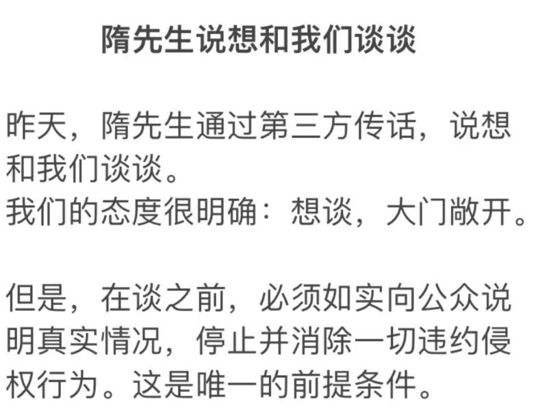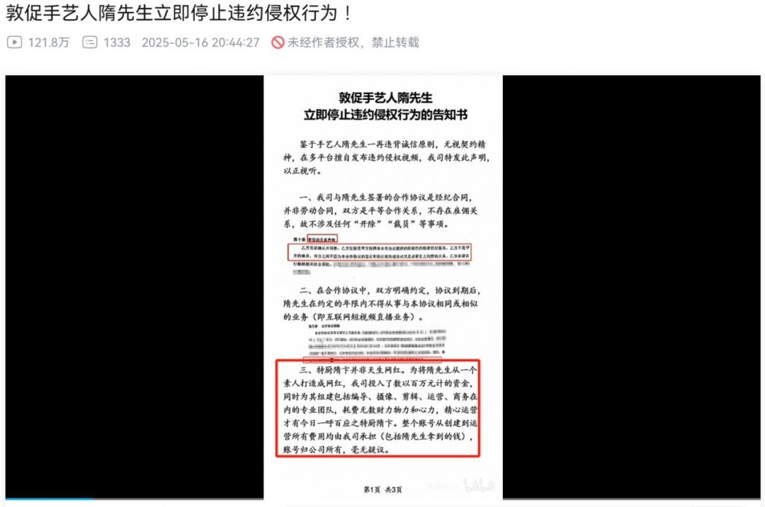 但就在“国宴”视频发布的第二天,由原MCN公司接管的账号“特厨隋卞”,便发布了一则措辞强硬的声明《敦促手艺人隋先生立即停止违约侵权行为!》。