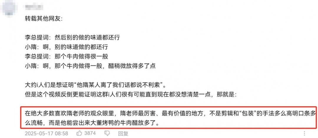 在受欢迎的博主视频评论区,经常出现“还不更新,生产队的驴都不敢那么歇”的玩梗评论。这类评论在今后在隋老师评论区,应当不会再出现了——毕竟,生产队的驴都未必有他们当初的工作量。要知道,生产队的驴只用拉磨,而当初的隋老师除了拍视频,还有厨师的本职工作。