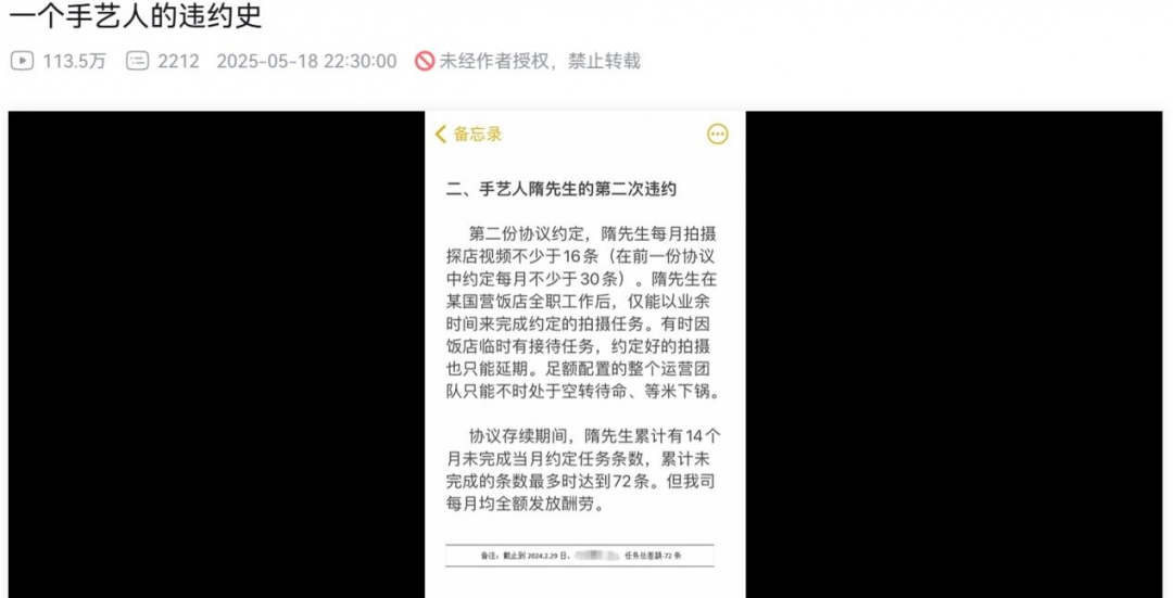 5月18日,“特厨隋卞”账号发布第二则声明,标题是《一个手艺人的违约史》,详细列举了数条隋坡先生的违约行为,试图证明隋坡先生违背契约精神。
