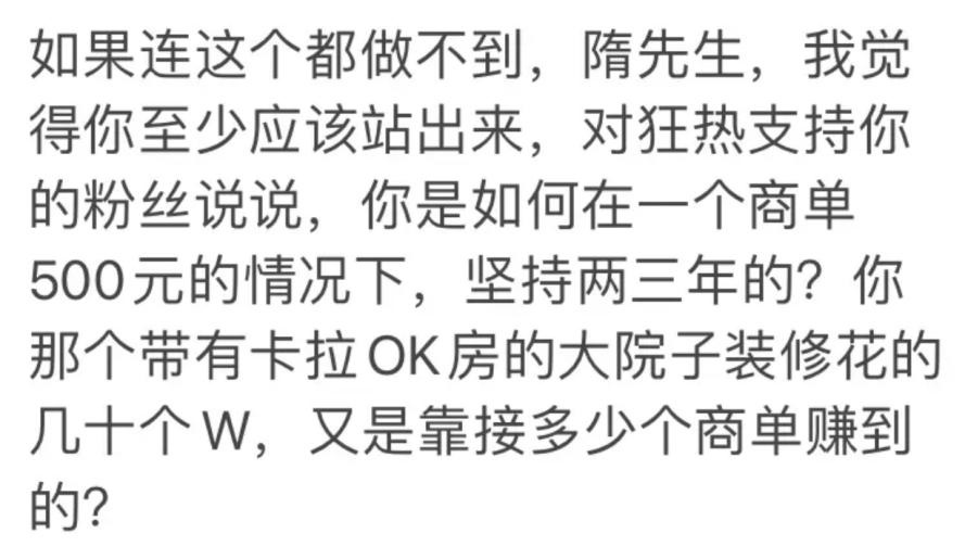 虽然单方面的证词并不足以说明这就是此事的真相,但自言“只会讲事实”的MCN公司,在试图辩驳这一点,却并没有真正地拿出具体的分成比例来,只是一味地质疑“如果只拿500的提成,隋先生装修的几十万哪来的”。