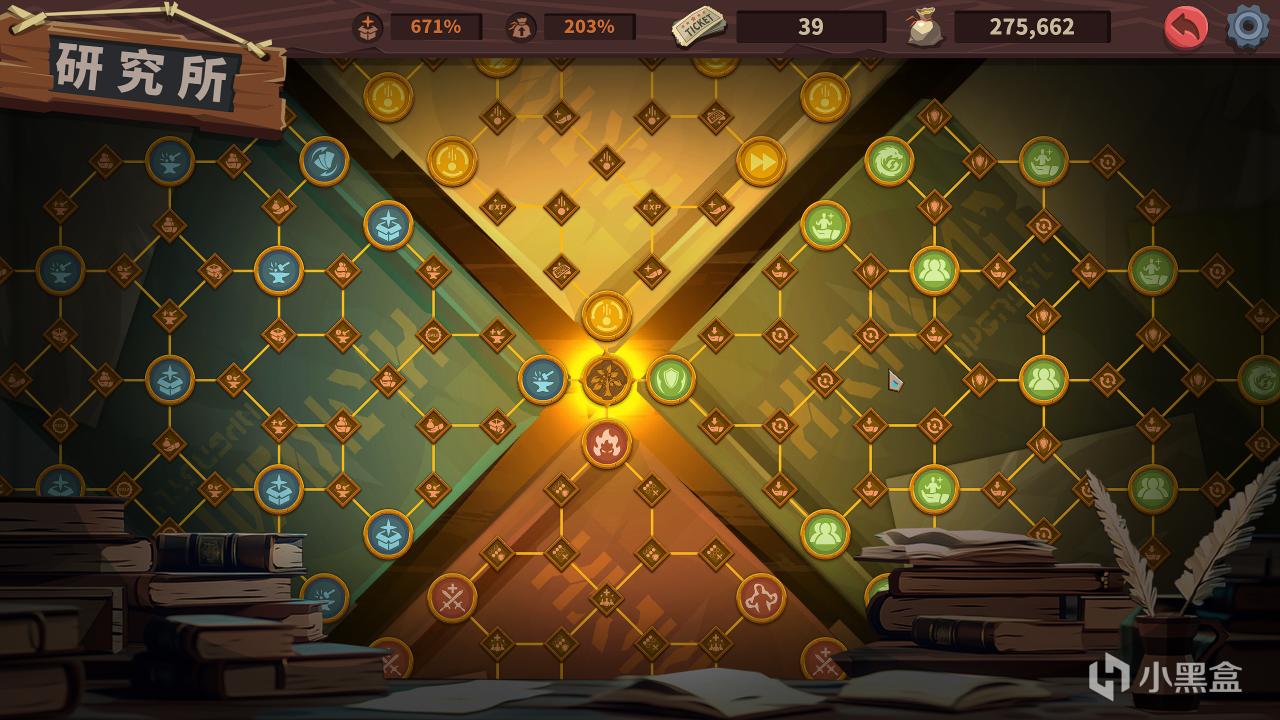 遊戲內有個重要設施叫“研究所”,裏面包含投幣、打造、戰鬥以及招募4大類,每一大類下鬥有數十個分支節點,需要靠玩家在闖關結算後獲得的“獎券”來一一解鎖。