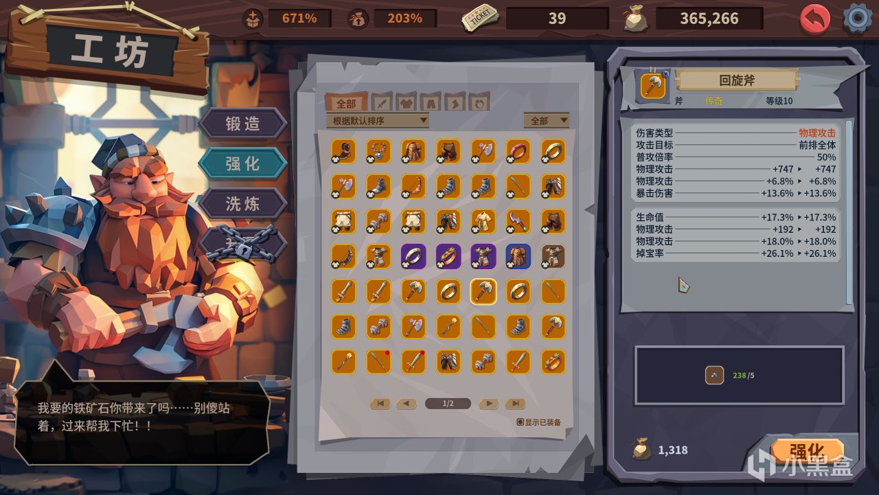 前期玩家不論獲得什麼裝備都不要嫌棄,直接裝備在勇者身上然後去闖關,裝備的加成幅度還是挺大的。到後面裝備慢慢多起來了之後便可以出售或者分解那些不需要的裝備,好一點的則可以在遊戲頁面的“工坊”設施中進行強化和洗練。