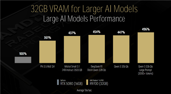 Radeon AI PRO R9700还可以支持四卡并行,搭配新发布的线程撕裂者PRO 9000WX系列,可以组成强大的PCIe 5.0 AI平台,总计128GB显存,轻松满足70B、123B大模型的需求。