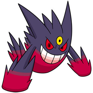 配色方面红色和紫色取自耿鬼的印象色,实际上耿鬼的紫色要更加灰暗,黑灰色则是代表幽灵系宝可梦身处阴暗环境的环境色,整体搭配给人一种邪魅的感觉。