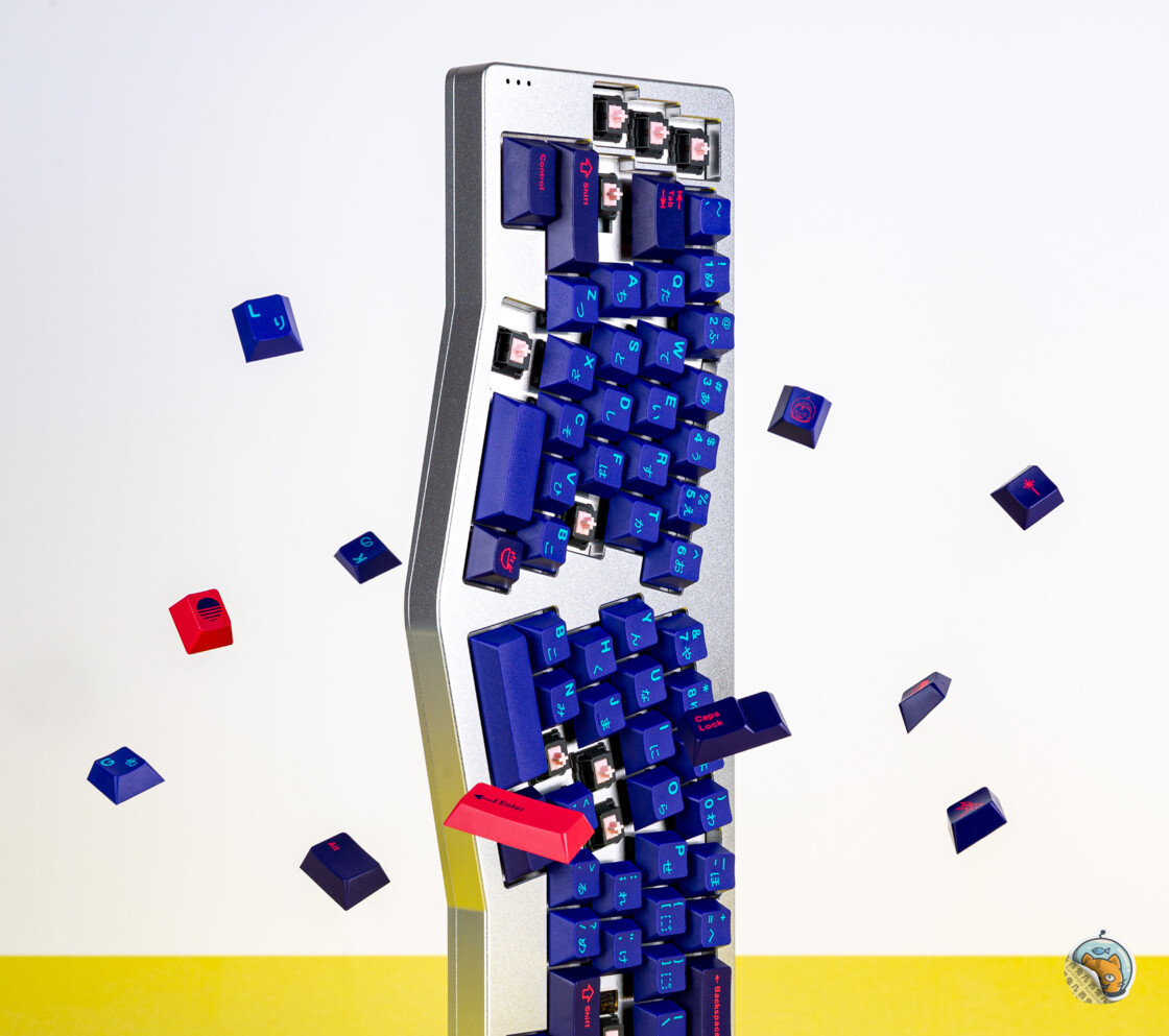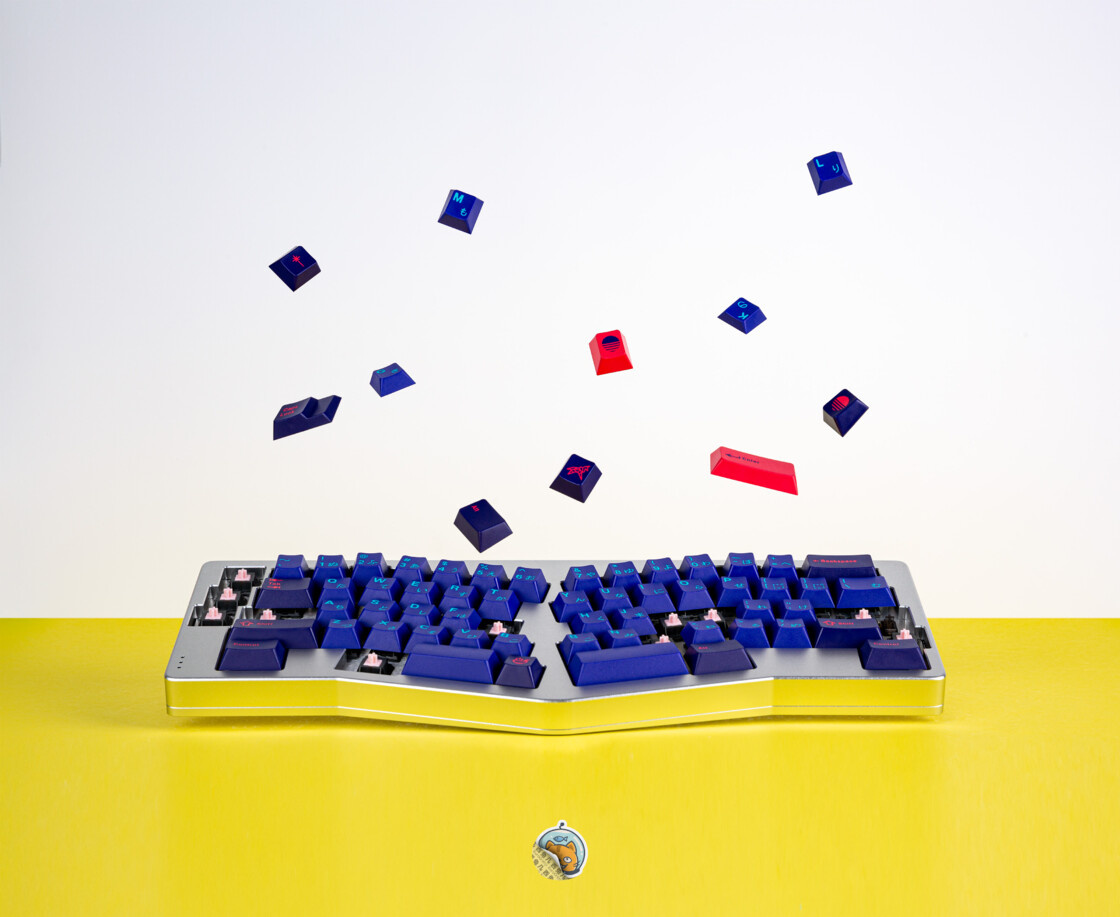 这款键帽在配色方面,蓝紫色搭配代表赛博霓虹灯的红色,犹如身处深夜中的不夜之都,灯光与酒色,红绿相映,令人目眩神迷。深天蓝色则是与紫色搭配组成主键区,如烟如雾的紫色可以缓和深天蓝色的沉重。