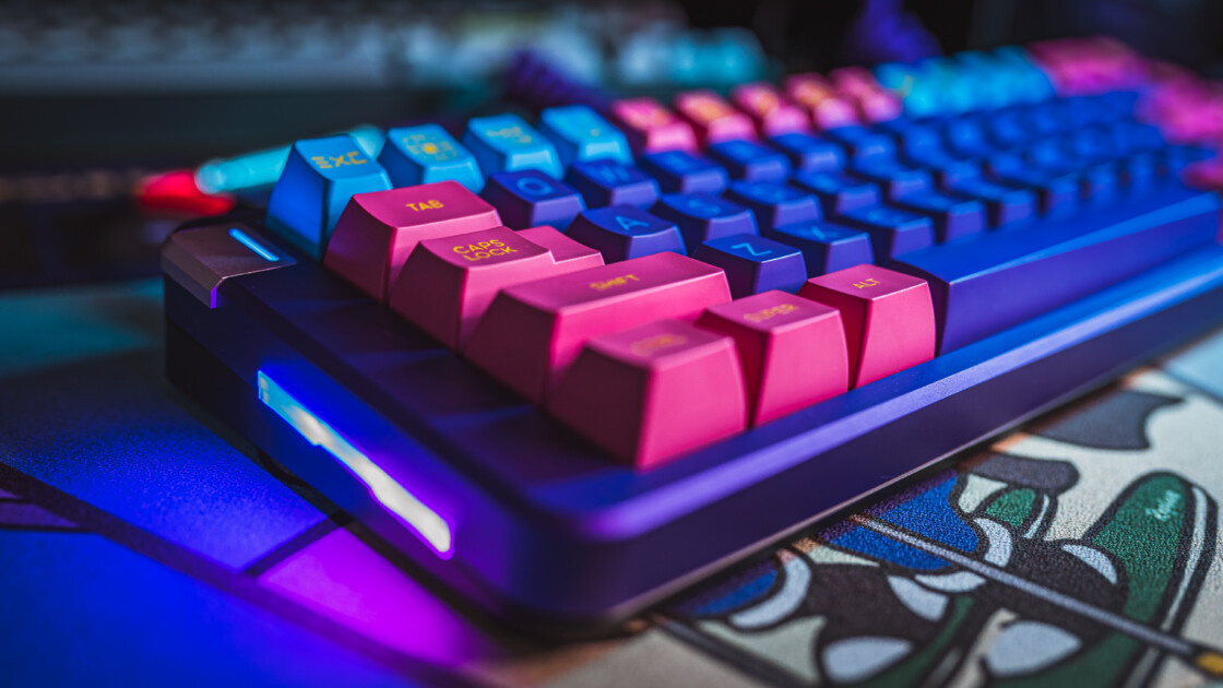 配色方面这款键帽选用洋红和暗紫作为基底色,如同霓虹灯闪烁,饱和高,色温冷,视觉冲击较大,亮黄和天蓝色作为字符点缀,对比强烈。