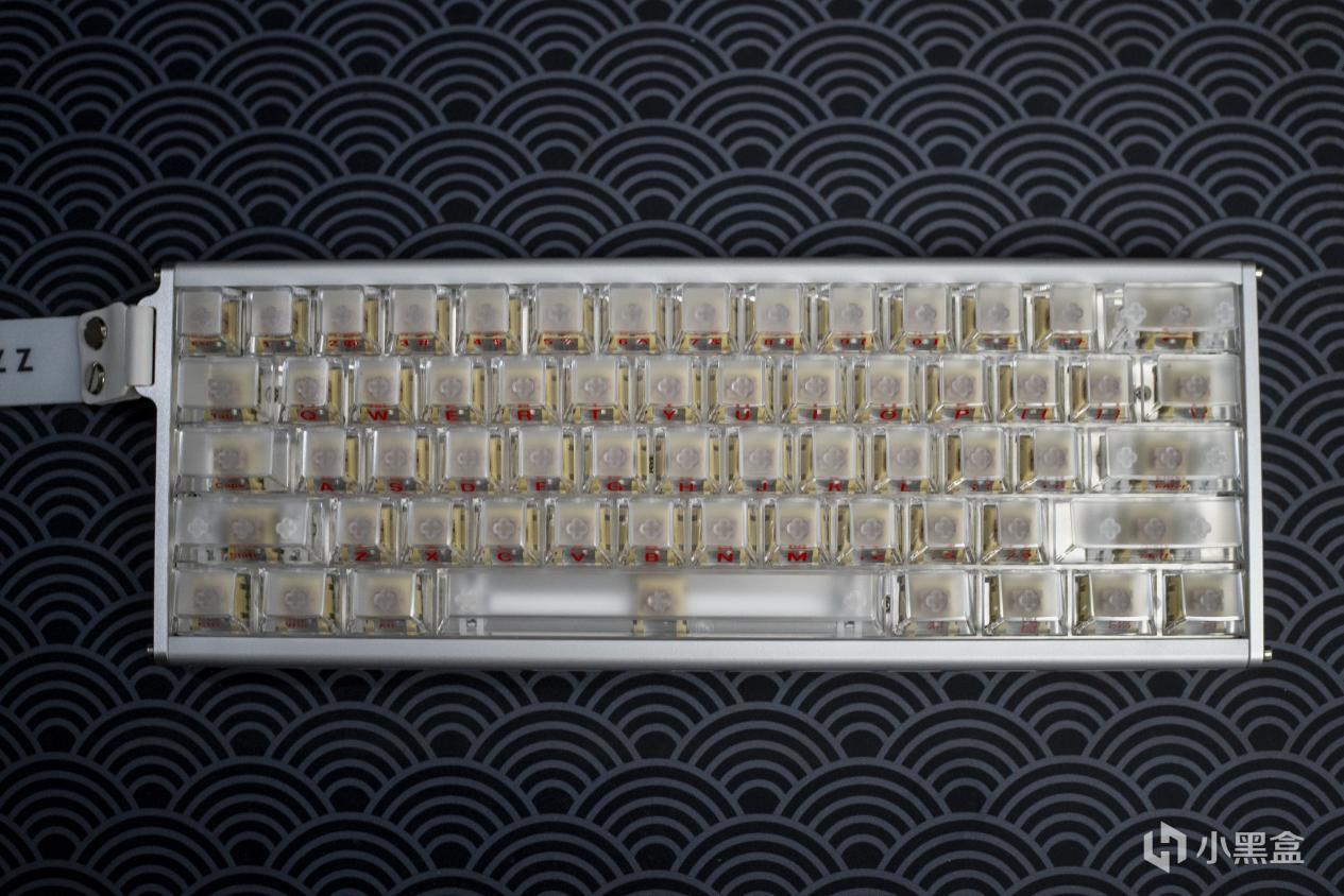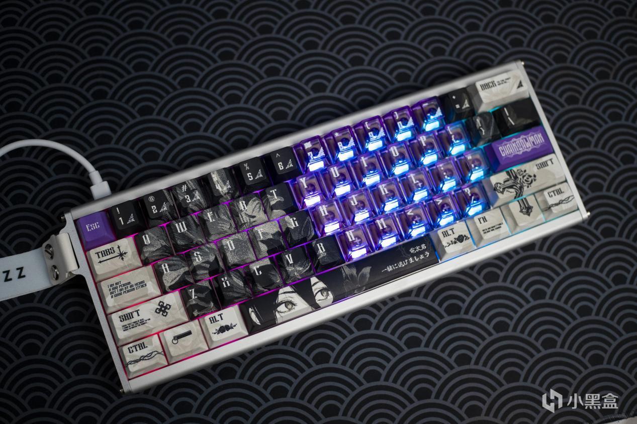 那麼上機部分,我這邊使用的“鍵帽展示架”是之前提到的,黑爵最新的ALUX 60,其銀白色的套件部分配合下燈位設計,還是比較適合蕾塞風格的,並且其原裝的PC鍵帽雖然高透,但純色多少是有點無趣了,對我這種二次元來說,果然還是都得換成老婆啊口牙!