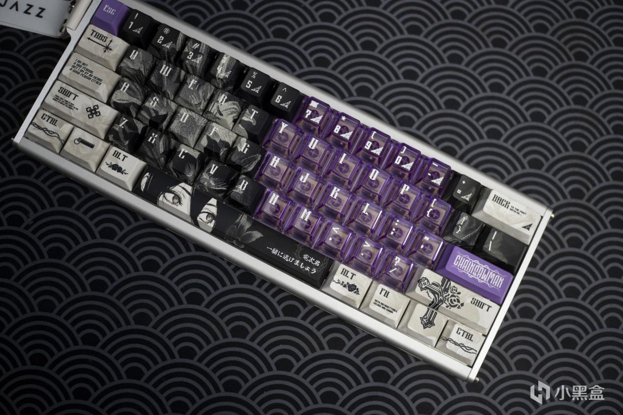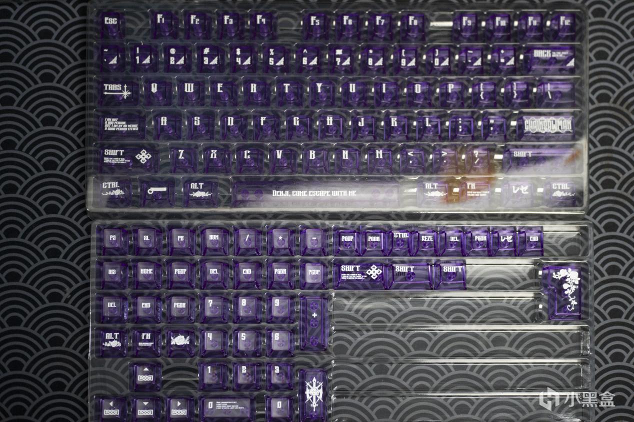打開包裝可以看到,其還是採用的祖傳吸塑包裝,本次的主體鍵帽採用的還是類似一二代的黑白色風格,並且其採用的更接近於“概念向”風格,並沒有其他廠商那種大面積分割的設計,我會更喜歡這種設計,其中ESC等特殊鍵做了紫色進行區分,可以說即使不入手PC高透補充鍵帽,這個顏值也是非常可以了。