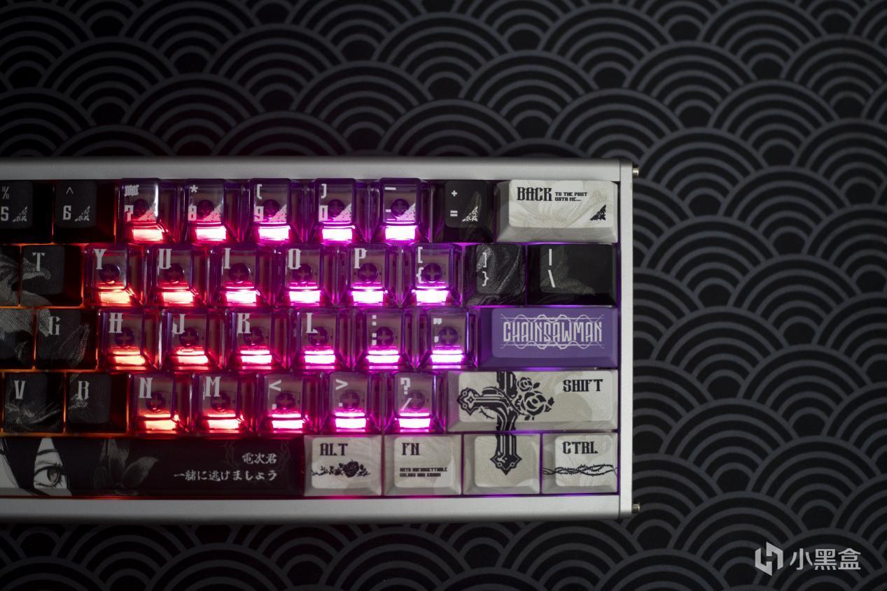 開燈之後可以看到,其亮面PC的質感也很不錯,雖然沒有他們家磨砂PC的水晶感,但比較通透的設計也是非常好看的,雖然PC本身會容易打油,但PBT的部分最不怕的就是打油,純純的乾爽寶,所以在重要按鍵的部分可以使用PBT材質,而在不怎麼使用的部分則可以使用PC材質來增加顏值,這樣可以最大程度的延長其“賞味期”