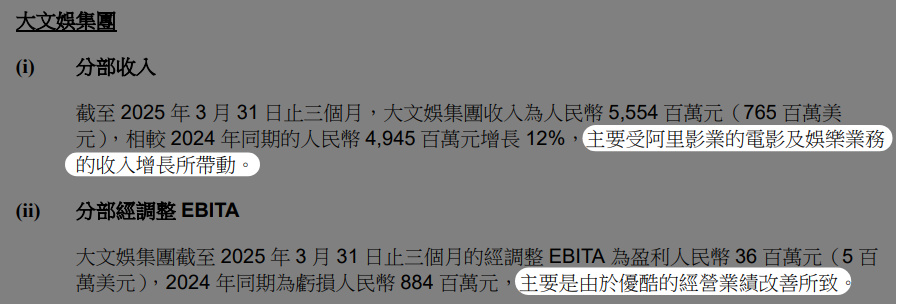 你千萬別被上面那句 “ 電影以及娛樂業務 ” 誤導,以爲是靠阿里影業投資的電影賺錢了。