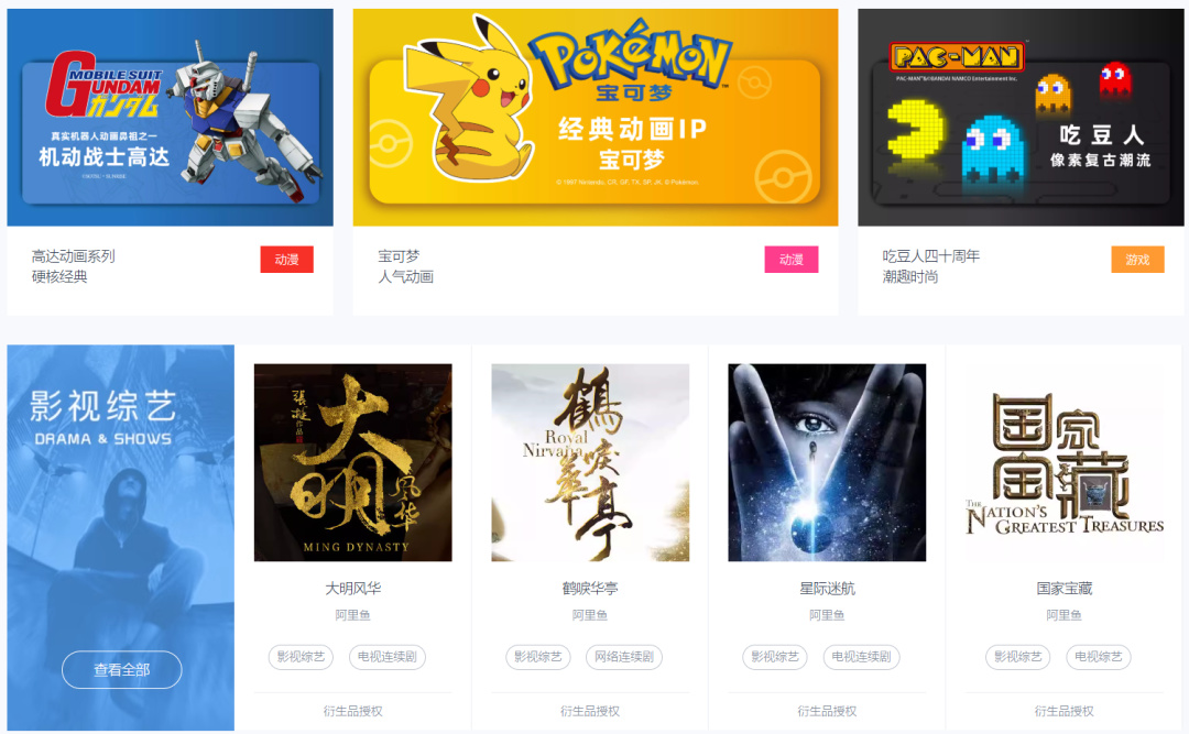 阿里魚的商業模式是,從上游版權方購買 IP,然後授權給下游商家收授權費,通過官網可以查到,目前阿里魚已涵蓋三麗鷗、寶可夢、Chiikawa、蠟筆小新等全球大火 IP。