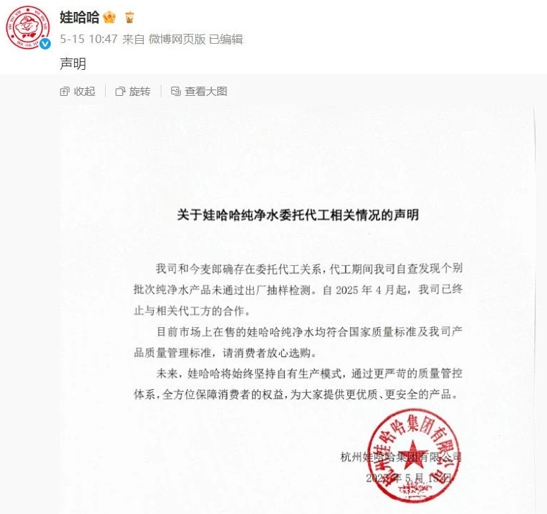 前两天,“#娃哈哈 客服回应纯净水由#今麦郎 代工”话题登上微博热搜,引发热议。