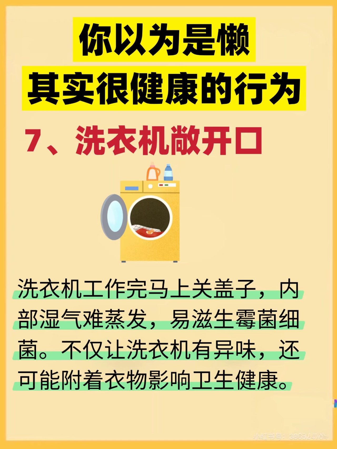 洗衣机工作完马上关盖子,内部湿气难蒸发,易滋生霉菌细菌。不仅让洗衣机有异味,还可能附着衣物影响卫生健康