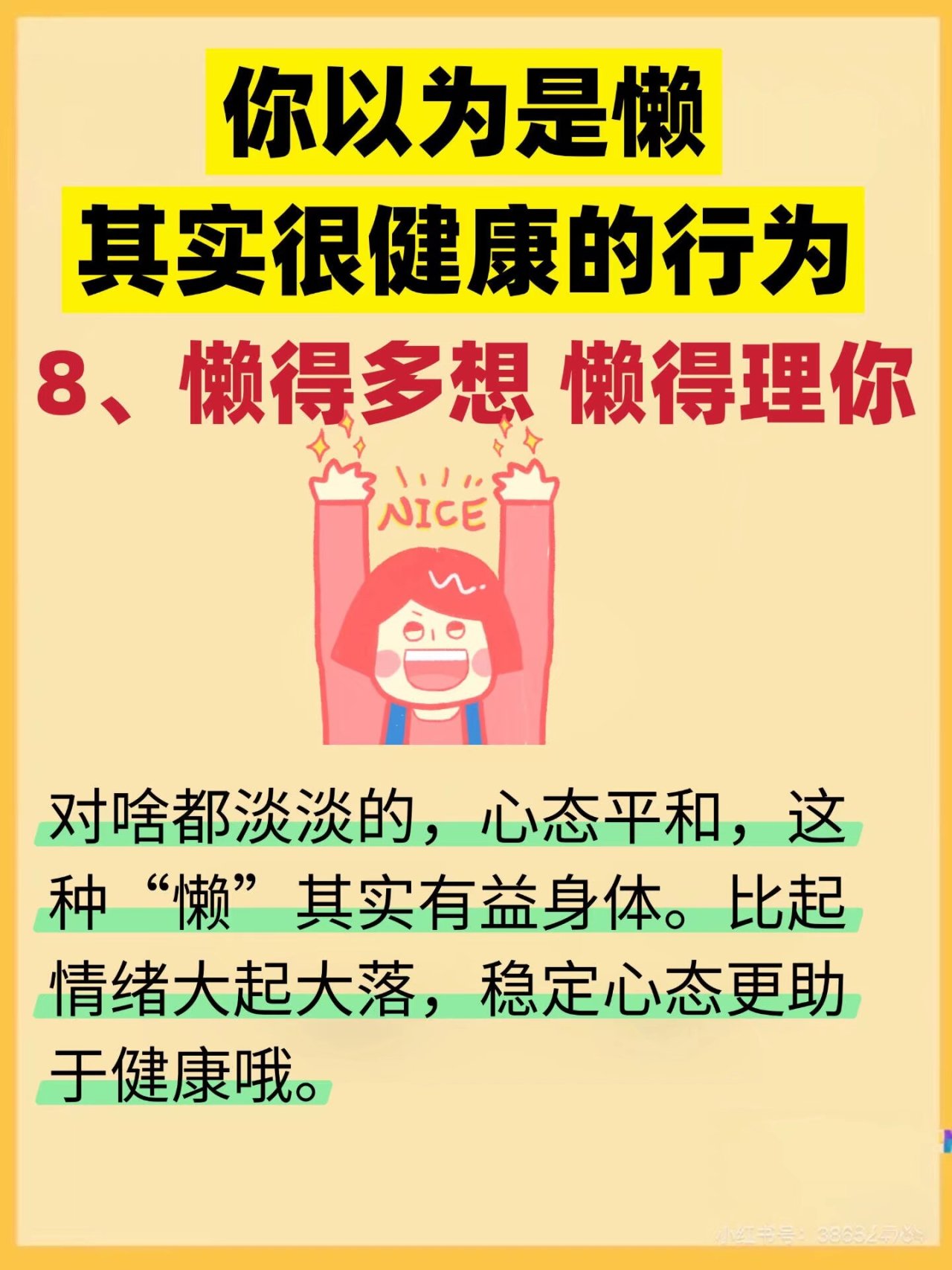 8⃣✅心态平和“懒”出健康:对啥都淡淡的,心态平和,这种“懒”其实有益身体。比起情绪大起大落,稳定心态更助于健康哦!!!