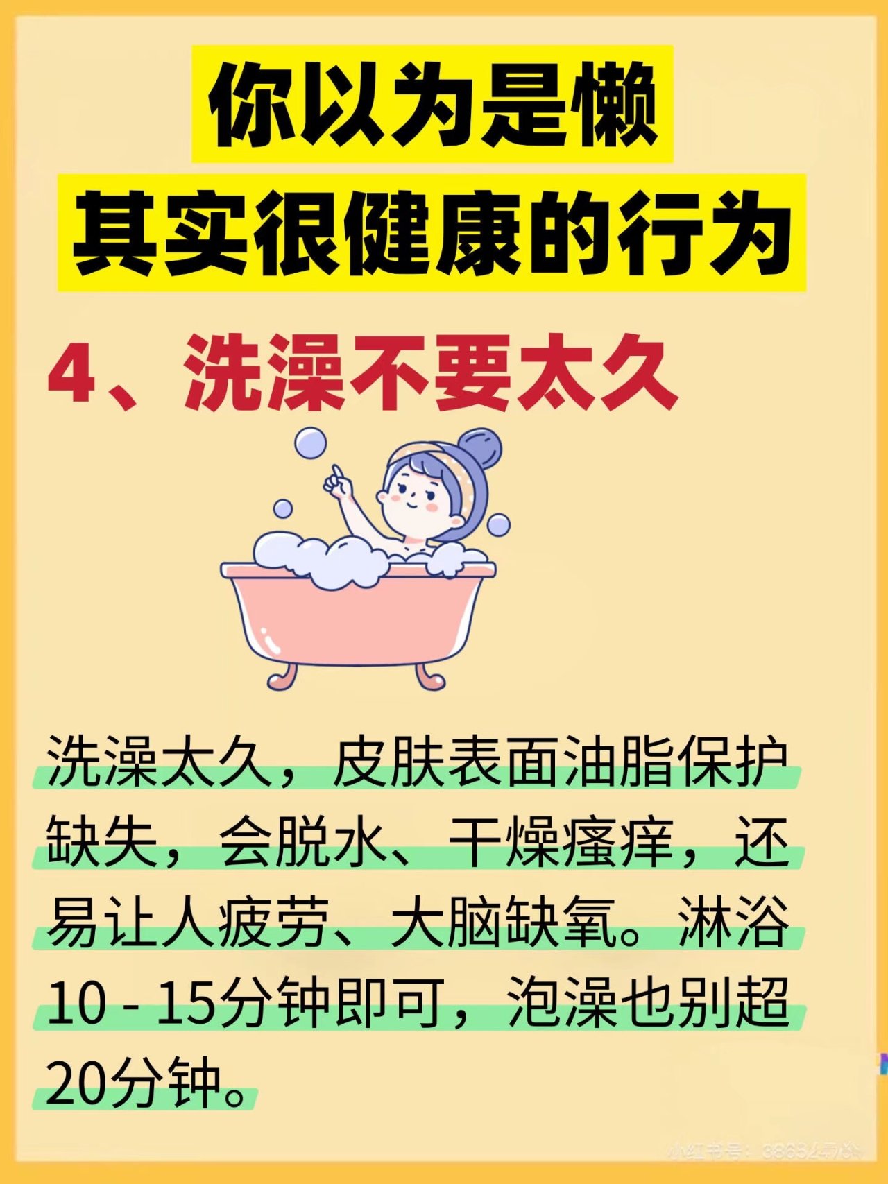 洗澡太久,皮肤表面油脂保护缺失,会脱水、干燥瘙痒,还易让人疲劳、大脑缺氧。淋浴10 - 15分钟即可,泡澡也别超20分钟。