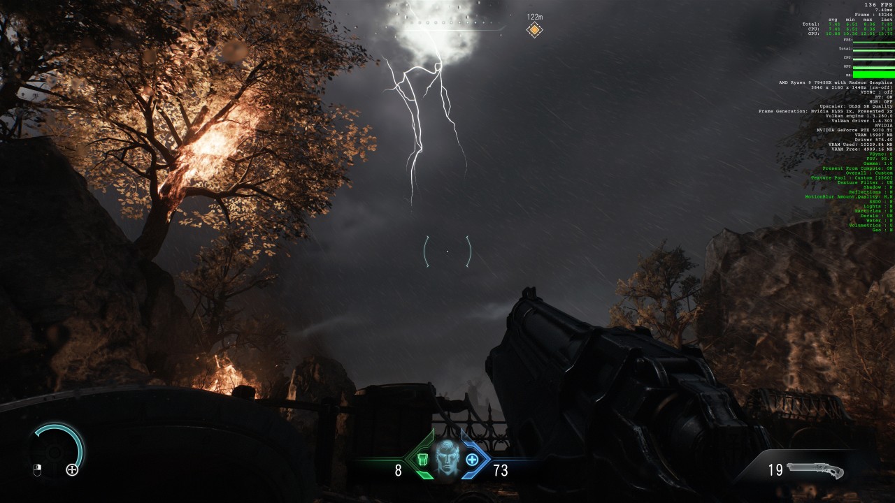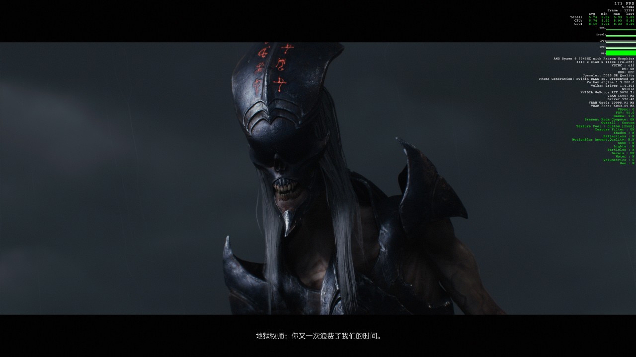 台式机:7945HX / 5070ti 可以在 4K 的分辨率下 特效几乎拉满 的情况下 稳定120帧。
