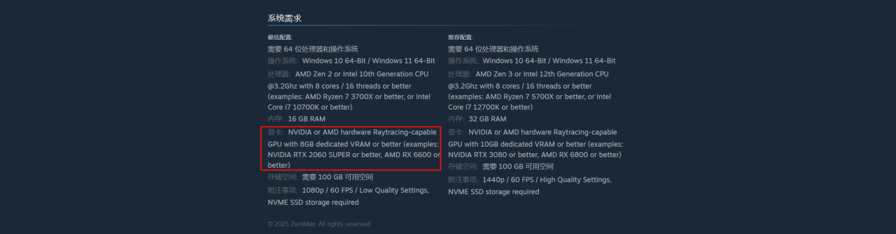 启动游戏需要支持硬件光线追踪且至少拥有 8GB独立显存的GPU。