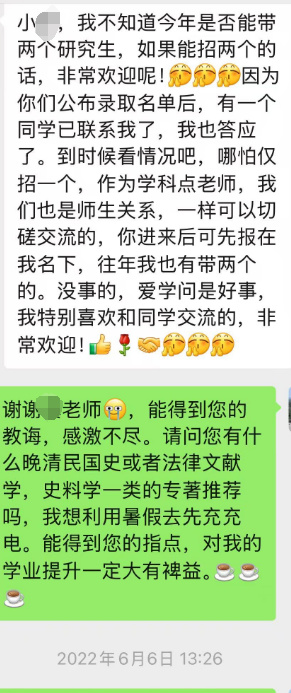 很快我就在机构给我的导师清单中找到了一位这样的好老师:待学生视如己出,经常请学生去家里吃饭;放养型佛系导师,从不开读书会;研究方向是我感兴趣的近现代法律史;履历过硬,教授职称。