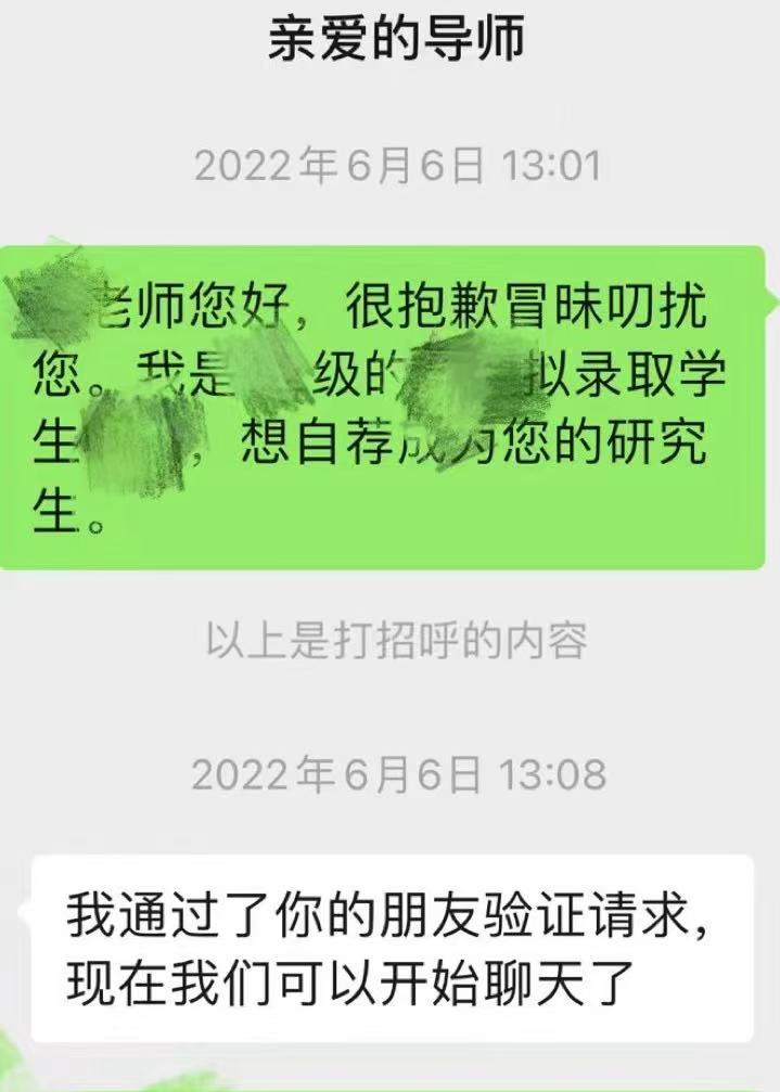 照理说先发邮件比较正式,但我们学校师生关系还行,所以我直接加了导师微信。开宗明义,先自我介绍,然后表达对老师的敬仰,接着毛遂自荐。