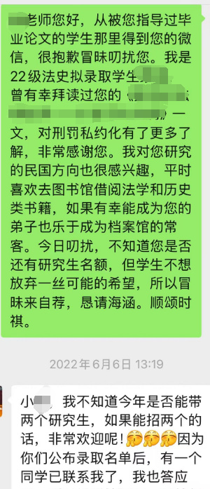 当然,研究生与导师是双向选择的关系。就联系导师而言,我没去找机构,也没有去学校的论坛,而是直接找的同届上岸的准同窗,因为他是华政本校的。