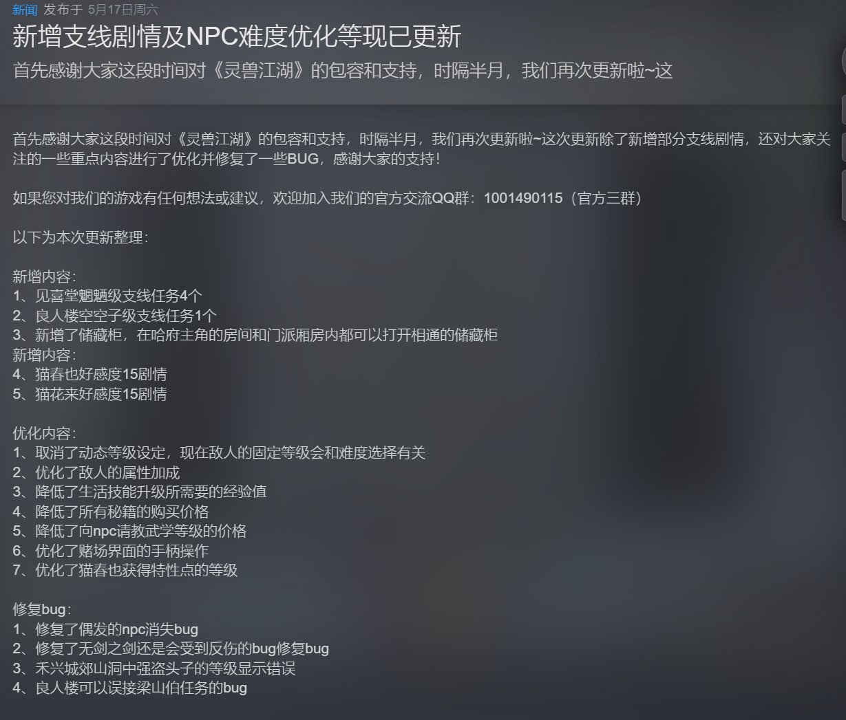 值得一提的是,游戏的更新频率之高,哪怕在武侠沙盒里也是独一档的存在。究竟有多离谱呢?举个例子,仅仅5月19日就连着发布了两个补丁,别的制作组可能每个月更新两次都算快的了,好家伙这直接一天两次!更丧心病狂的是5月20日赶忙又上了新补丁,咱就是说你们都不用陪女朋友的吗?我已经雷牛满面了家人们。
