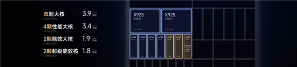 CPU采用10核4丛集架构,配备两颗Arm Cortex-X925超大核,四颗A725性能大核、两颗低频A725能效大核和两颗A520超级能效核心。