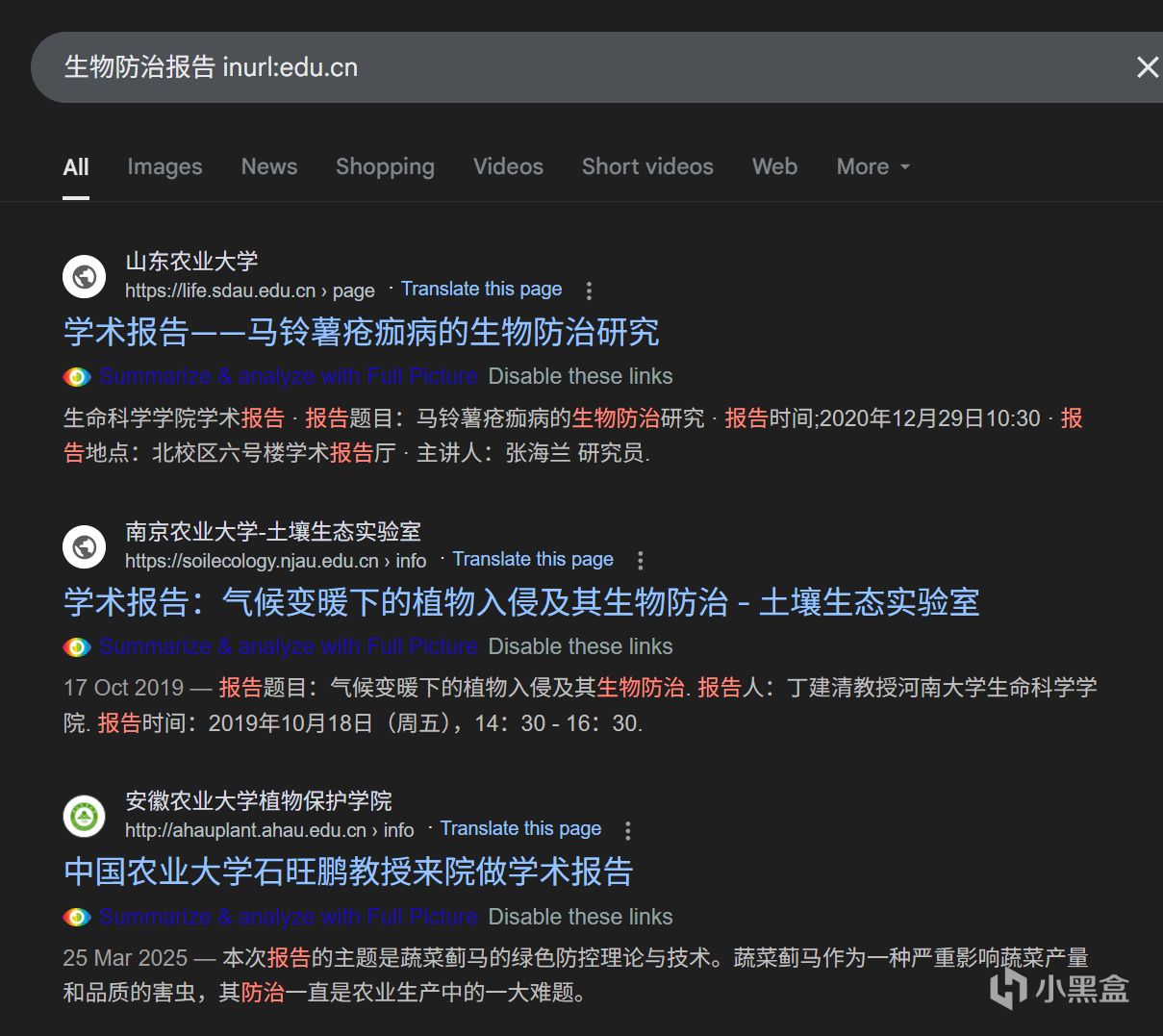 我们可以看到我在咕咕噜上输入了inurl:gov,这就意味着我需要一个包含生物防治报告关键词且网站带有edu.cn,这意味着我需要得到的结果各个大学的包含生物防治报告关键词的页面。