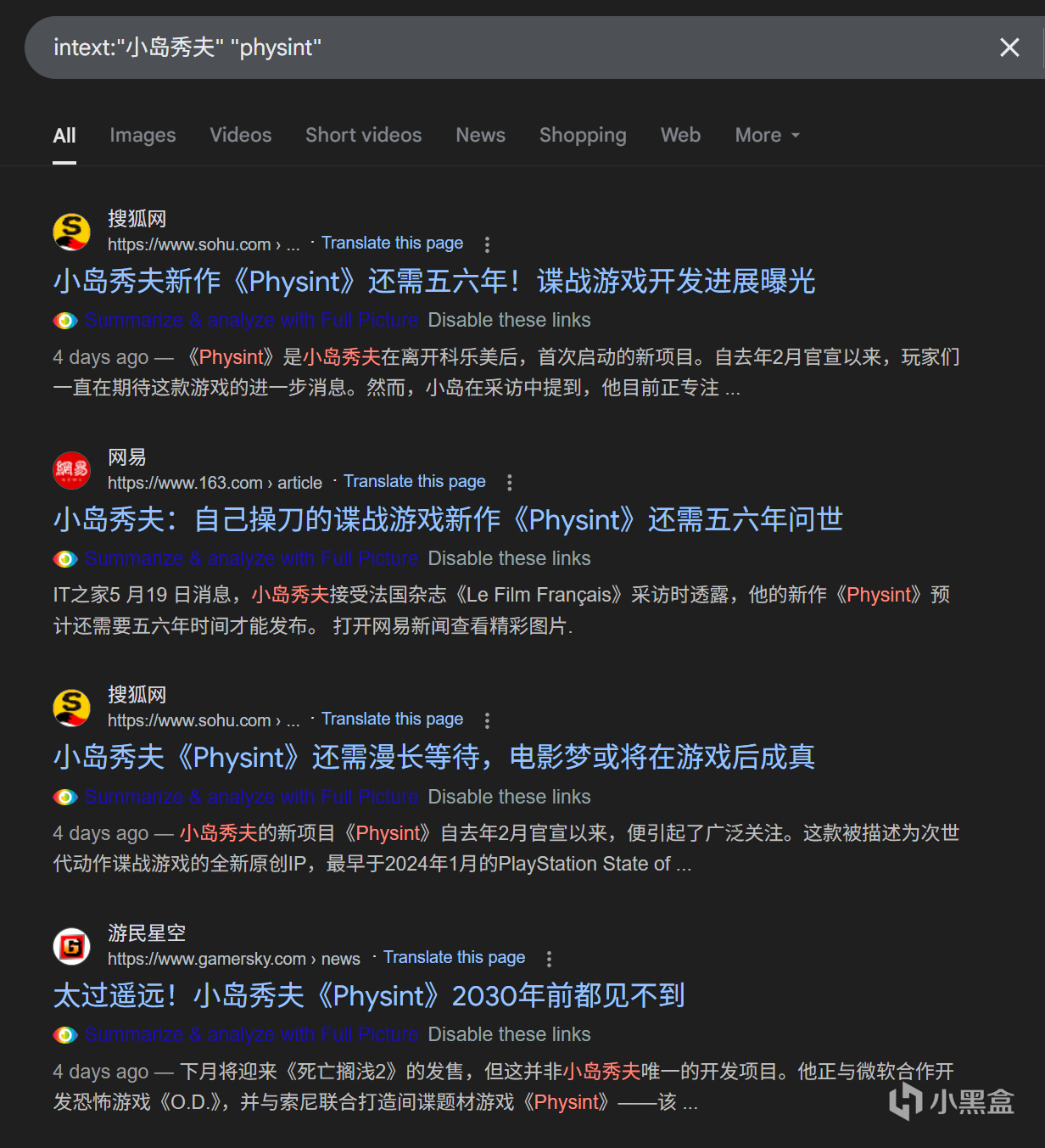我们以小岛最近画大饼的新作为例,我们需要所有文章内包含小岛秀夫和physint这两个关键词的文章。还记得我们最开始讲的双引号么,我们可以直接将他们组合为intext:"小岛秀夫" "physint"