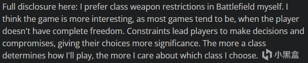 《战地》玩家表示:我个人更喜欢《战地》里的职业武器限制。我认为,当玩家没有完全的自由度时,游戏会更有趣,就像大多数游戏一样。限制会促使玩家做出决定和妥协,让他们的选择更具意义。职业越能决定我的游戏方式,我就越在意自己选择哪个职业。