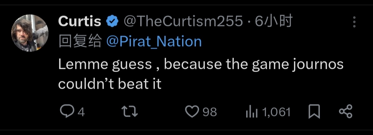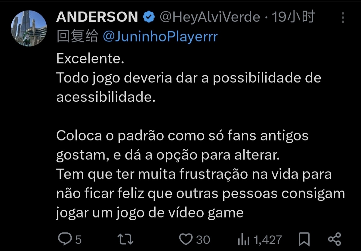 “很好。每个游戏都应该提供可游玩性,即把标准设为只有老粉丝喜欢的,然后提供改变的选项。生活中得有多少挫折才会不为别人能玩上电子游戏而高兴。”