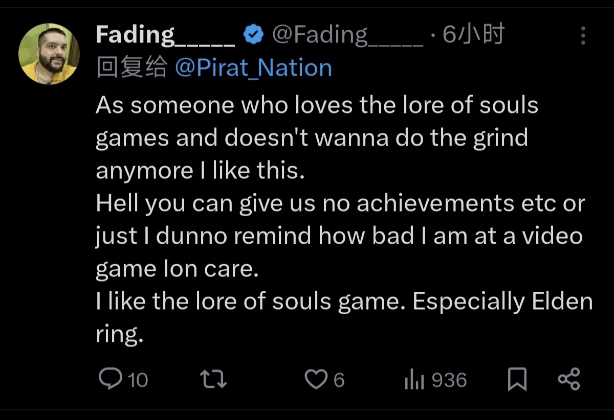有些玩家玩魂游的关注侧重则并不在战斗等内容上。作为一个热爱魂类游戏剧情但不想再重复刷级的人,我喜欢这个(难度选项)。厂商甚至可以不给我们成就之类的,提醒他自己在电子游戏上有多差,我不在乎。我喜欢魂类游戏的剧情,尤其是《艾尔登法环》。