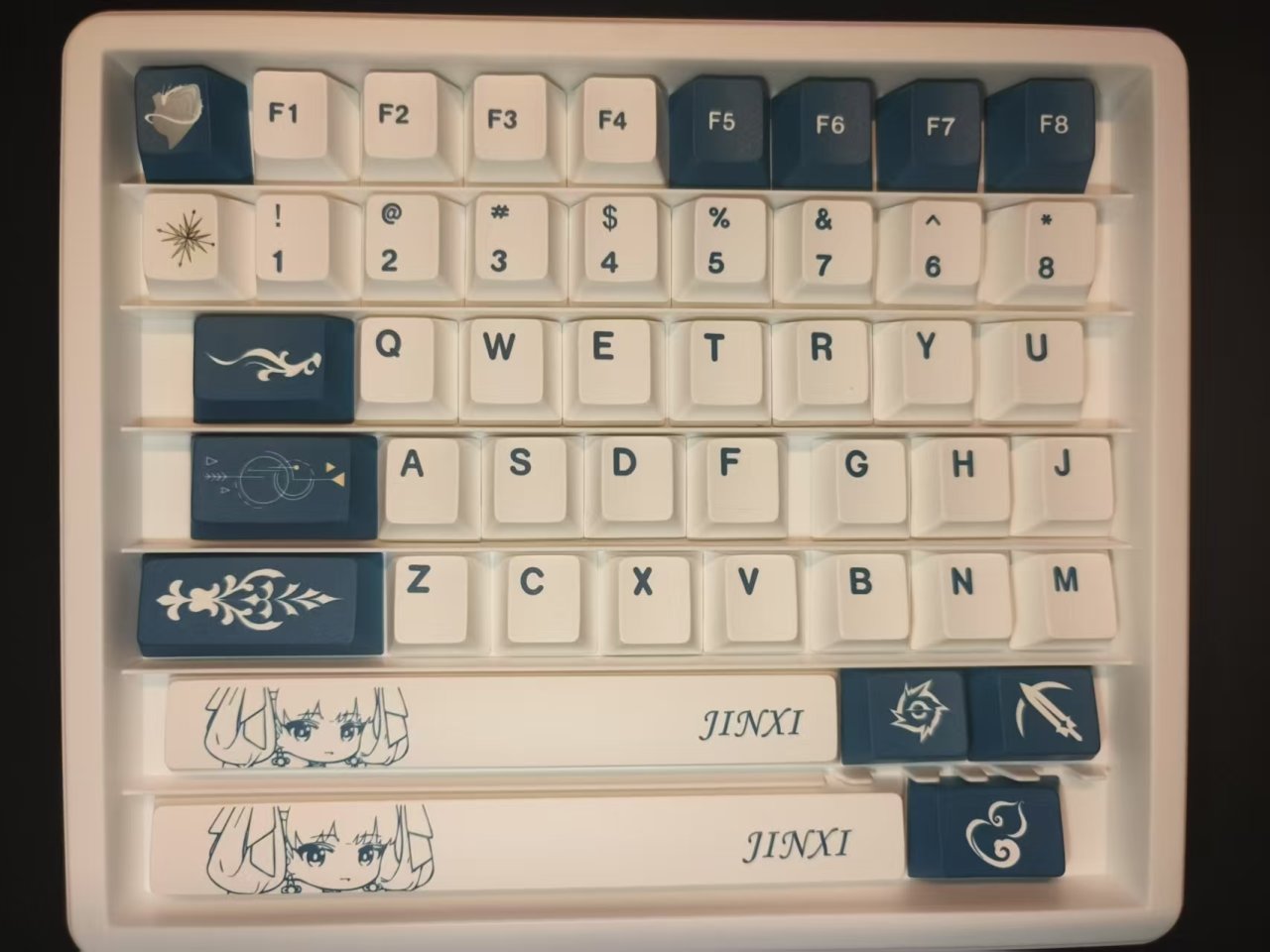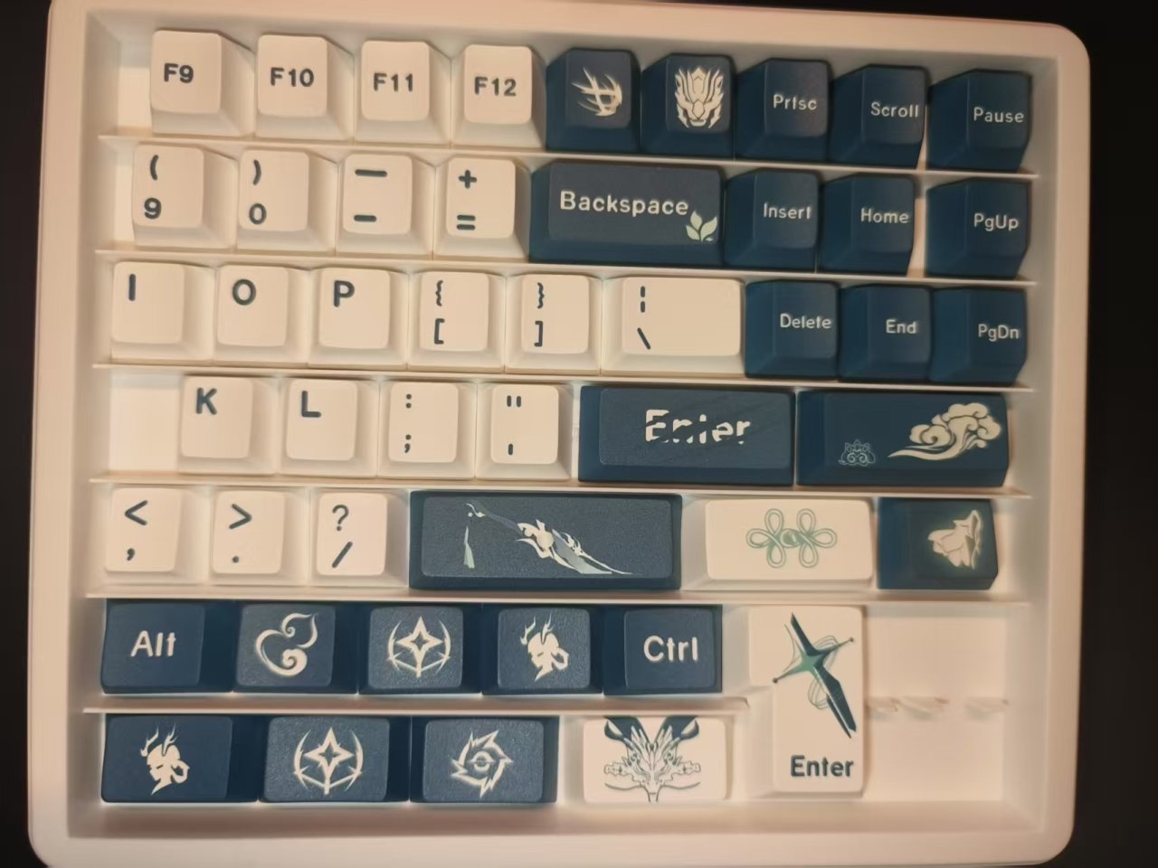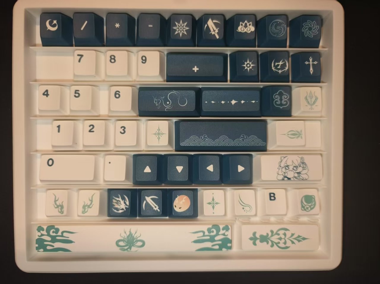這款鍵帽的整體配色以青黑色與白色爲主,整體風格相對比較簡約,並沒有特別花裏胡哨的圖案,但是每一個圖案都經過了精心的設計,上面的風格與紋路與今汐的人物形象非常符合。