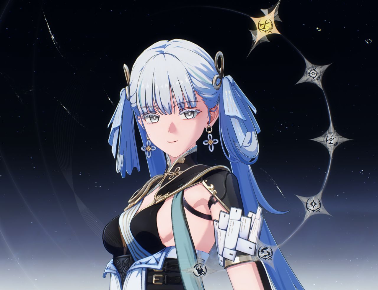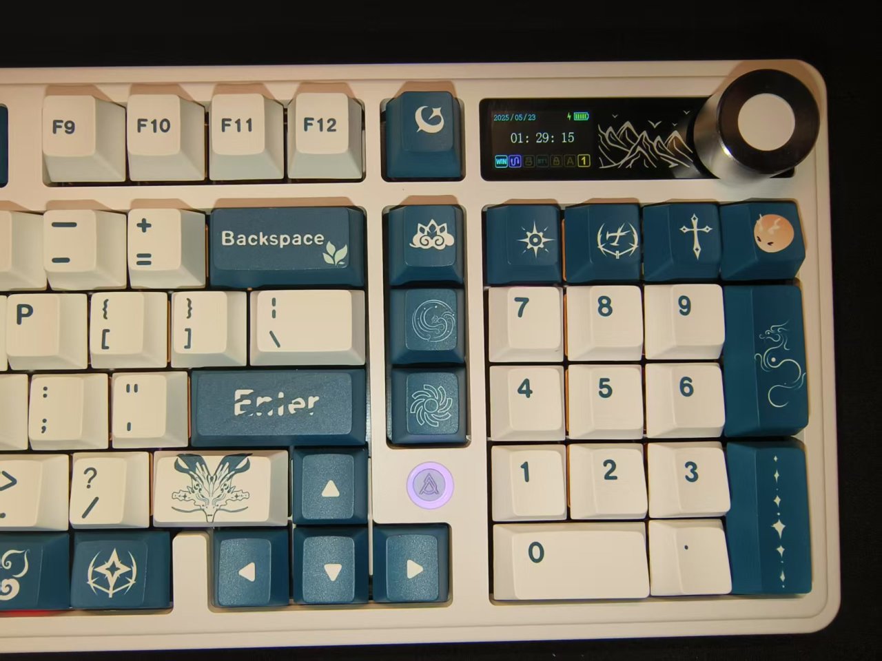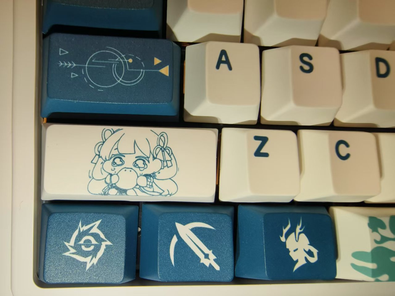 這款鍵帽的整體配色以青黑色與白色爲主,整體風格相對比較簡約,並沒有特別花裏胡哨的圖案,但是每一個圖案都經過了精心的設計,上面的風格與紋路與今汐的人物形象非常符合。