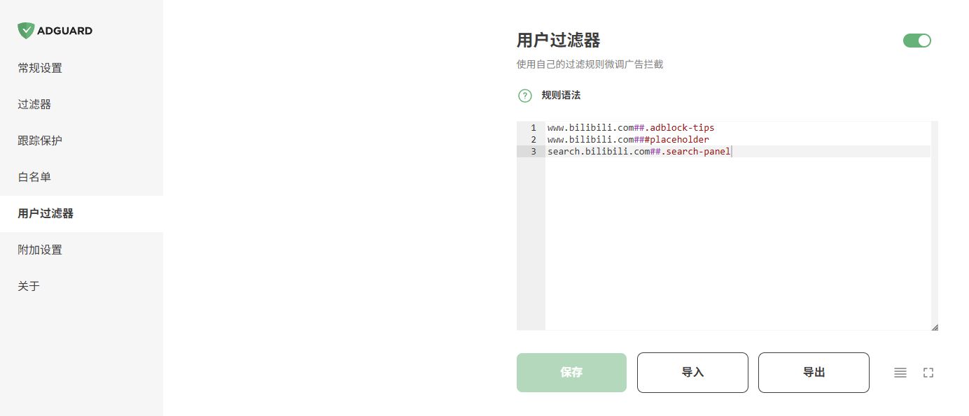 左側導航欄點擊用戶過濾器,複製粘貼我給的代碼並保存。別忘了打開右上角開關以啓用規則。
