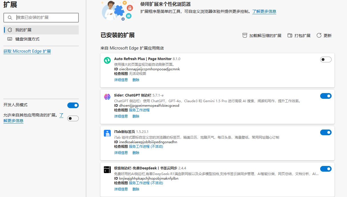 開關插件需要點擊進入管理擴展程序,與edge不同,chrome的開發人員模式開關在右上角。