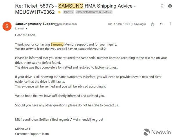 於是再94%健康度的時候,Khan向三星申請質保並寄出了SSD,結果幾天後的回覆讓他怒從中來。