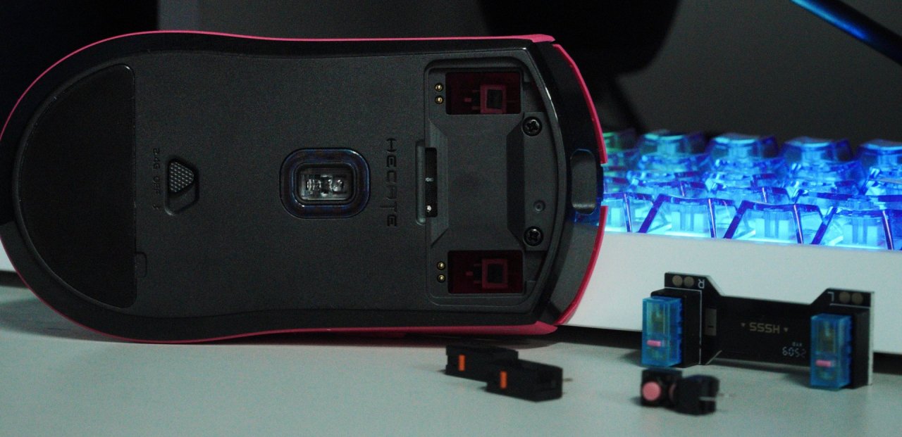 只需要將鼠標底部的小殼子掰開,就能直接拿出來,替換其他微動。這種快拆的樣式我很喜歡,現在市面上很多說是支持熱插拔的鼠標要麼有線連着,要麼要掀開腳貼,就很麻煩。