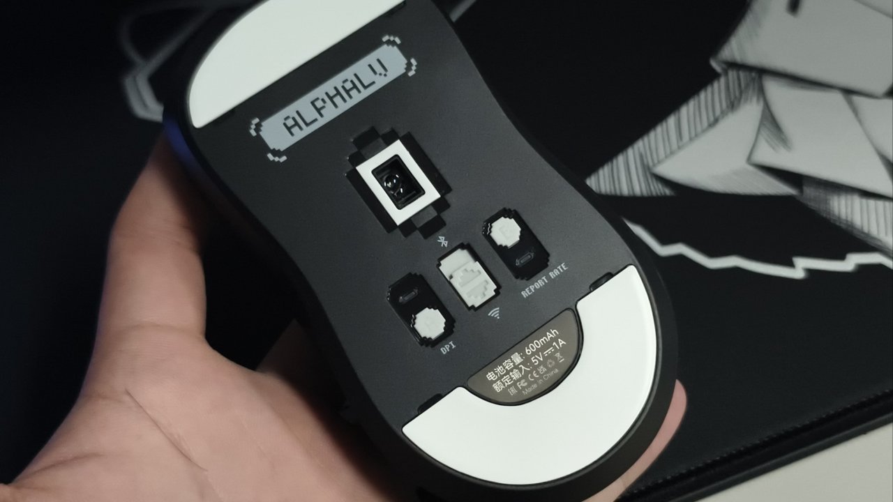 這玩意的設計還不錯,你看到底部你能看到積木風格的3個按鍵,分別是:DPI按鍵/連接模式切換開關/回報率開關,它連回報率按鍵都整了,這個我在其他鼠標上確實沒有見到過,所以這款鼠標你甚至都不用連接驅動了。