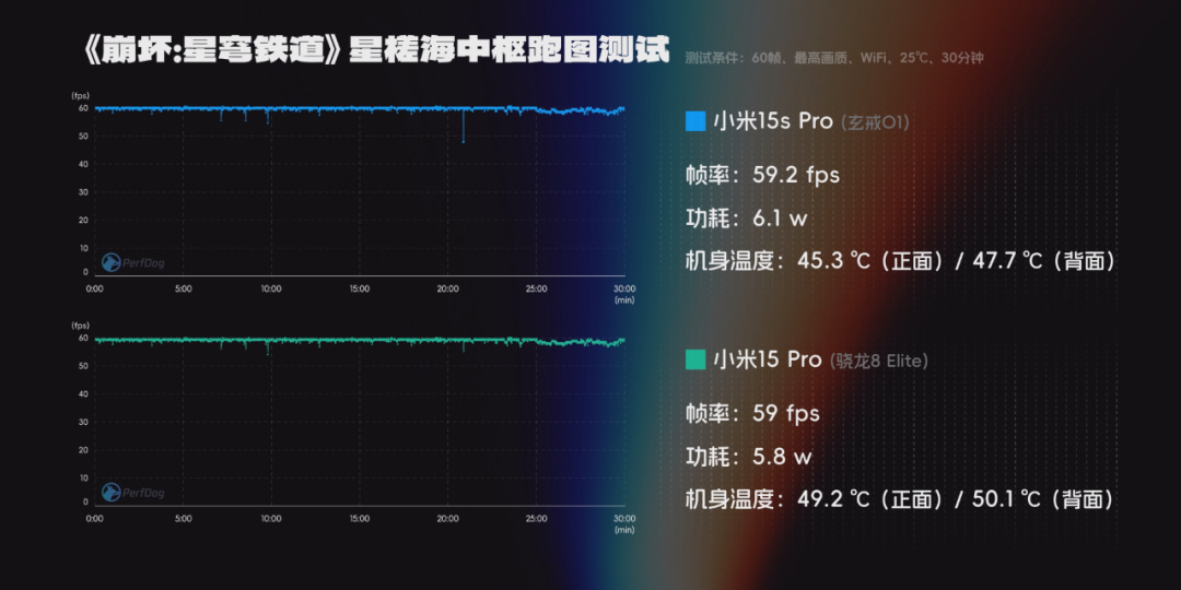 繼續上強度,來到壓力更大的星鐵,小米 15S Pro 也絲毫不虛,平均幀率 59.2 ,最高溫度 47.7 度。 小米 15 Pro 這次表現還要更差一點,平均幀率 59 幀,溫度直接奔 50 了。