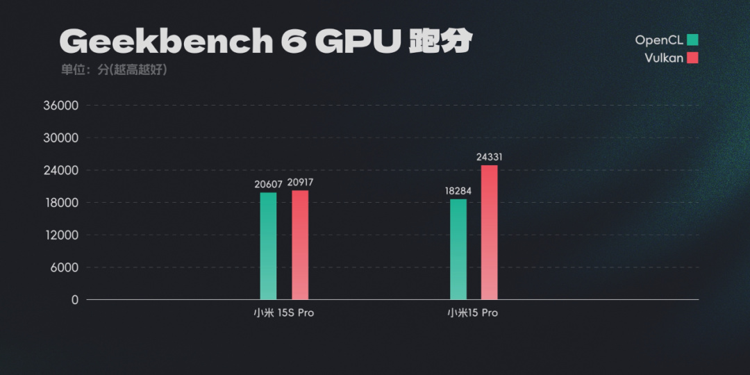 在 Geekbench 6的 GPU 測試中, 15S Pro 的 OpenCL 分數是 20607 ,要強於 15 Pro ,但 Vulkan 分數明顯是要差高通不少。