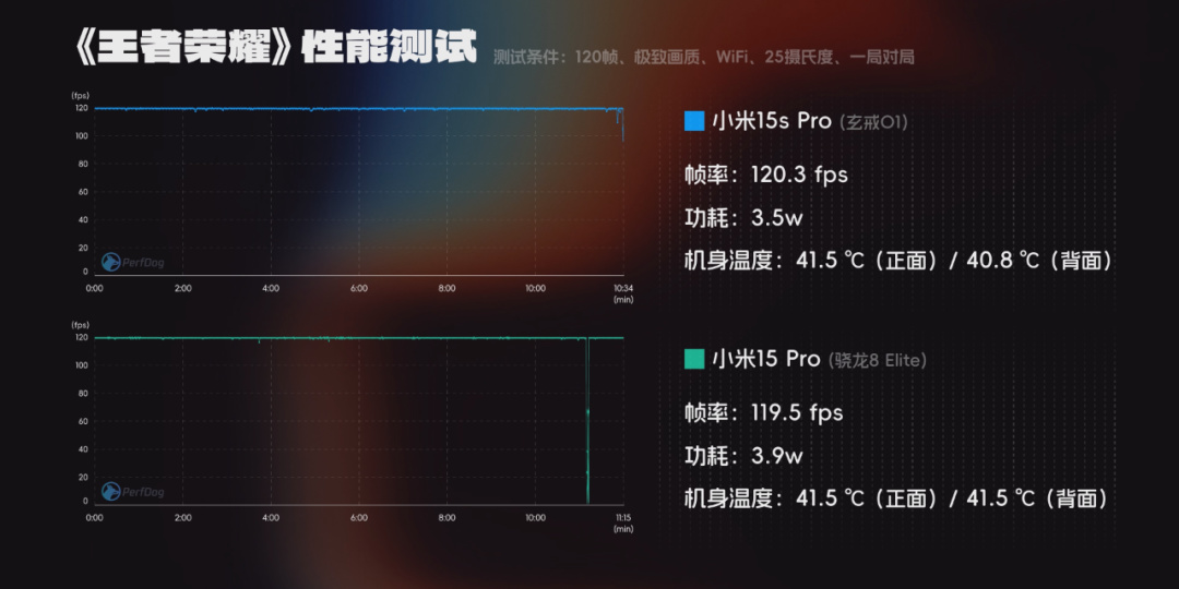 我們先拿王者榮耀試試深淺 —— 根據 Perfdog 的記錄,半小時搓下來,小米15S Pro 跑出了 120.3 幀,幀率幾乎就是一條水平線,只有測試最後有一點波動,平均功耗 3.5W ,最高溫度也只有 41.5 度,微微冒汗。