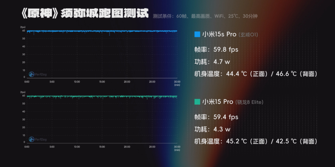 原神須彌城跑圖 30 分鐘,小米15S Pro 是 59.8 幀,幀率很穩,功耗爲 4.7W ,機身最高溫度 46.6 度。作爲對比的 15 Pro 平均幀率 59.4 幀,功耗 4.3W ,機身最高溫度 45.2 度。