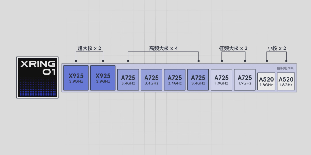 在 CPU 的架構設計上,玄戒 O1 分別用了 2 個 3.9GHz 的 X925 超大核,4 個 3.4GHz 的 A725 高頻大核,2 個 1.9 GHz 的 A725 低頻大核,還有 2 個 1.8GHz 的 A520 小核。除此之外,還集成了一顆 44 TOPS 算力的 NPU 。