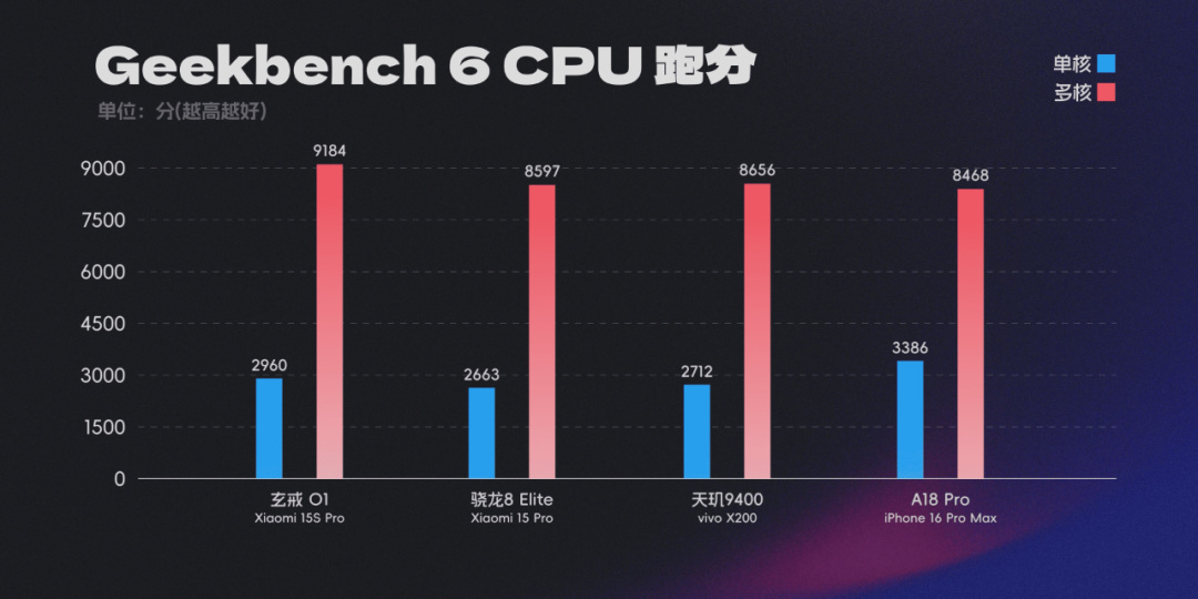 爲了讓場面更加熱鬧一些,我們還加入了天璣 9400 ( vivo X200 )和 A18 Pro ( iPhone 16 Pro Max ) 作爲對比,一番大混戰下來的結論就是 —— 玄戒 O1 可太能打了。。。小米憋了快十年的大招,不會真的上來就能跟高通 & 蘋果 & 聯發科掰手腕吧?
