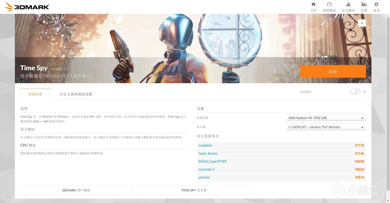 6.Time Spy 最常用的显卡+cpu跑分项目,赛博斗显卡项目,点击运行,简单理解为在dx12(新游戏基本都是dx12)+2k分辨率下你显卡+CPU能跑多少帧(分)