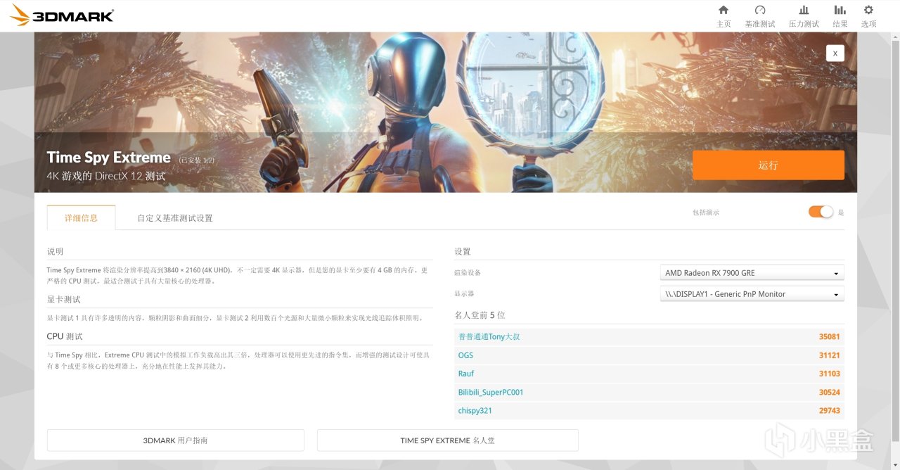 7.Time Spy Extreme 常用的显卡+高负载cpu跑分项目,赛博斗显卡项目,点击运行,简单理解为在dx12(新游戏基本都是dx12)+4k分辨率下你显卡+高负载CPU能跑多少帧(分)