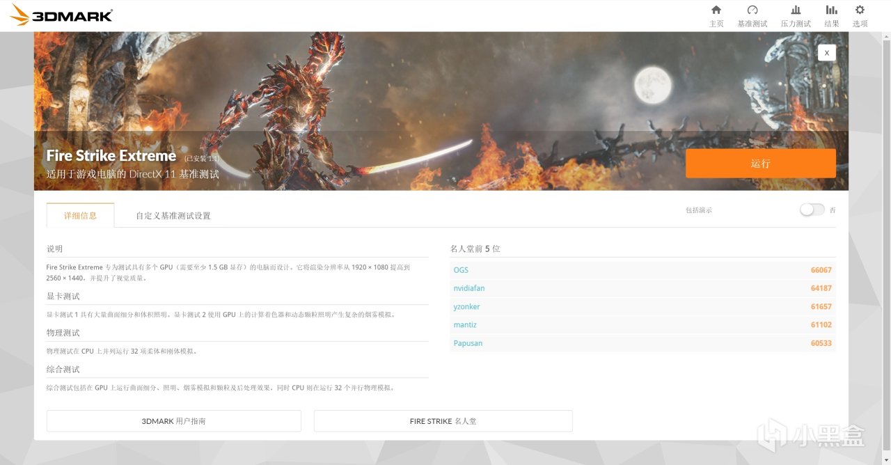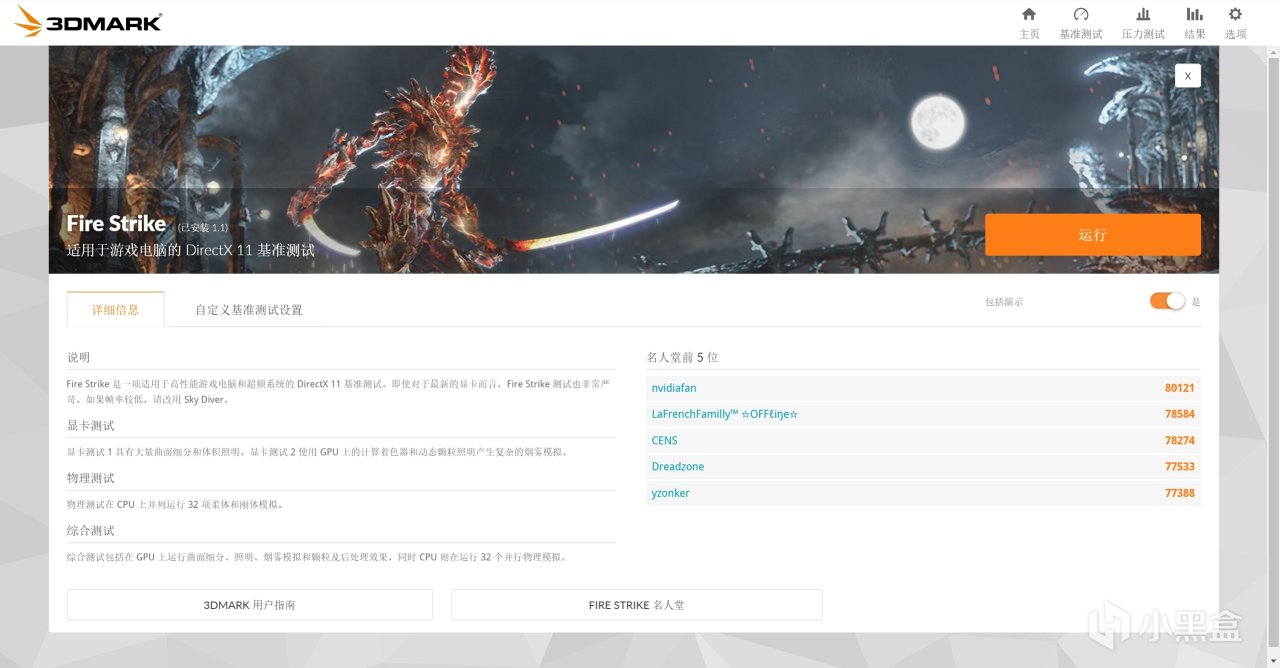 8.Fire Strike 常用的显卡+高负载cpu跑分项目,赛博斗显卡项目,点击运行,简单理解为在dx11(老3A例如gta 巫师3)+各种分辨率下你显卡+CPU能跑多少帧(分),也可也做超频显卡下超频稳定性验证